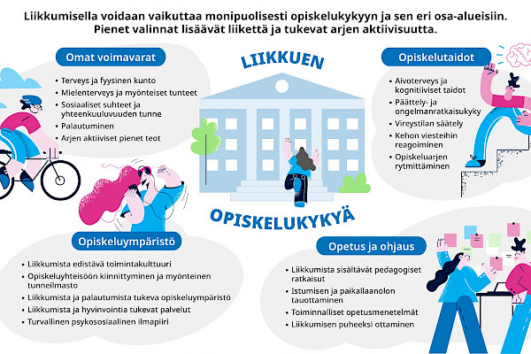 The Moving for a better study ability model is based on the model for study ability (Kunttu 2006) updated by the Finnish Student Health Service (FSHS) in 2022. It examines study ability and its various aspects from the point of view of physical activity.