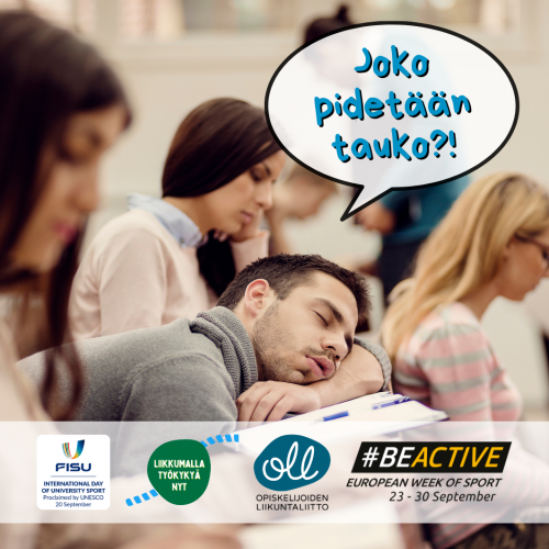Opiskelijoiden Liikuntaliiton (OLL) tämän vuoden #BeActive-teemaviikoilla 22.9.–3.10. kiinnitetään huomiota paikallaanolon tauottamiseen opiskelupäivän aikana. Liikuskelu opiskelun lomassa parantaa opiskelukykyä, mutta opiskelijat istuvat yhä 10,5 tuntia päivässä.